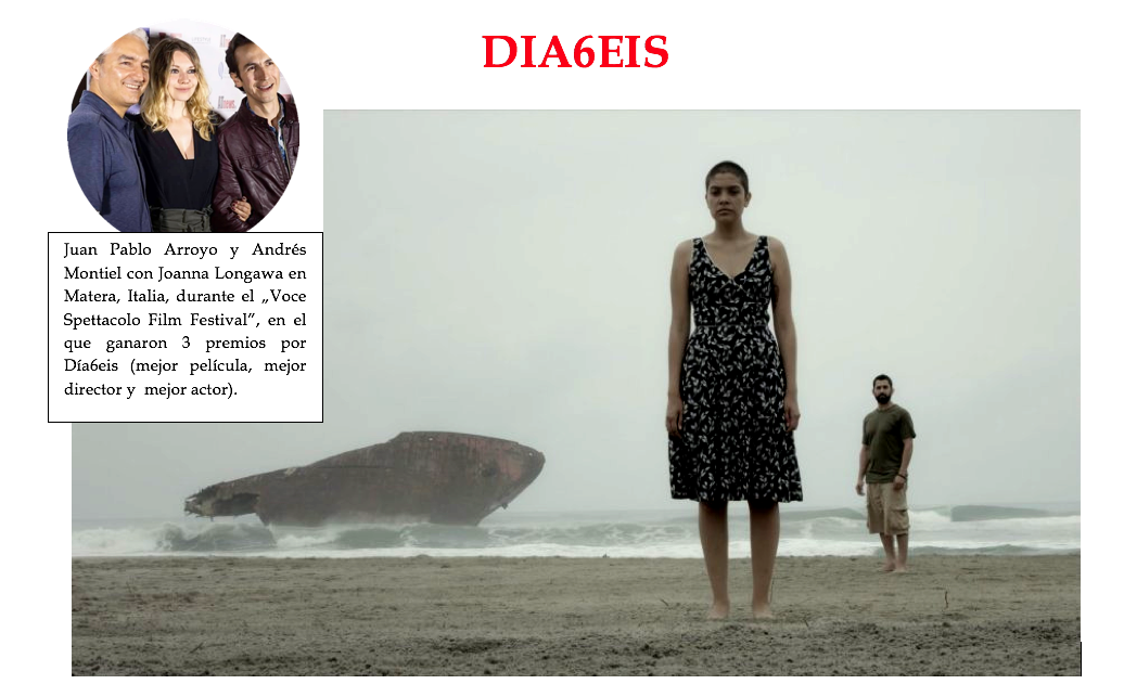 “Dìa6eis” es una película mexicana muy reconocida a nivel mundial, lo que le ha valido muy merecidos premios en numerosos festivales durantes los años 2016 y 2017, entre otros, Barcelona Planet Film Festival, Romania 12 Months Festival, Wolves Independent International Film Awards, Festival de Cinema da Figueira da Foz, South Texas International FF, London BELIFF FF, NIFF NEXT IFF, Milan International Filmmaker Festival of World Cinema, Festival Internacional de Cine de Tequila, Matera Voce Spettacolo FF y muchos otros. Su director, Juan Pablo Arroyo Abraham, múltiple “mejor director” – en colaboración con SOLARIS, Dejarme Disfrutar Films y Geiser Films – creó en 102 minutos una imágen de la vida humana compleja, refinada y profundamente trágica, asemejándose a un verdadero drama triangular shakeasperiano de tres componentes: Carmen (Abril Cira), Pablo (David Medel) y Joaquín (Andrés Montiel). La llave de esa obra maestra, entre otras cosas muy personal y sobre todo metaliteral, se esconde en este conglomerado de palabras: poesía – arte y tiempo – muerte.
